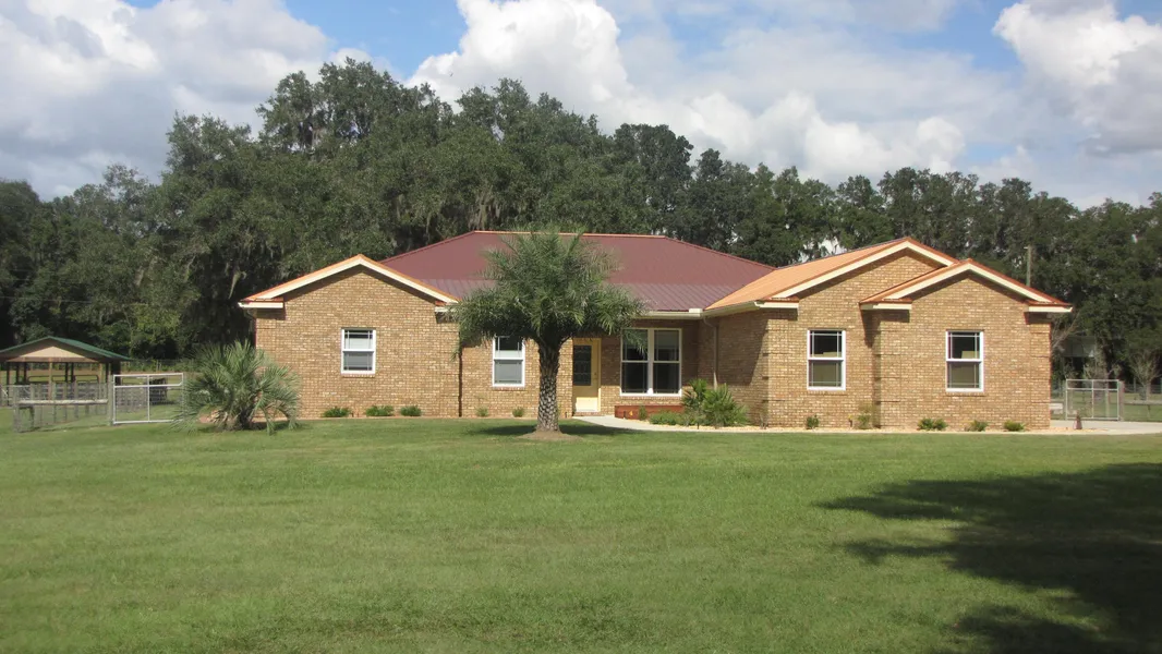 Concrete Block & Brick 3/2 Home, with office that could be a fourth bedroom. Master Bedroom has attached Gym/Sitting Room. Home is like new and in MINT condition. Split, open floor plan, 9'4" ceilings, modern kitchen with quartz counter tops, high-end appliances, Pella Windows and Bali insulated adjustable shades, office with separate entrance, crown molding, Kymar copper metal roof. Fenced and cross-fenced. Large screened back porch, polished concrete matte finished floors in living area, LED lighting, walk-in closets, Kohler sinks, tubs & toilets. Landscaped and irrigated. Wired for solar panels. High-efficiency A/C. Cavity wall insulation. (Electric bills $100-$200/month). 16'x24' Pole barn, 65'x40' block shop/barn (13'4" high with three 12' roll-up doors) plumbed for bathroom. Many more extras. Ideally located just south of Belleview with easy access to I-75, Ocala and The Villages.