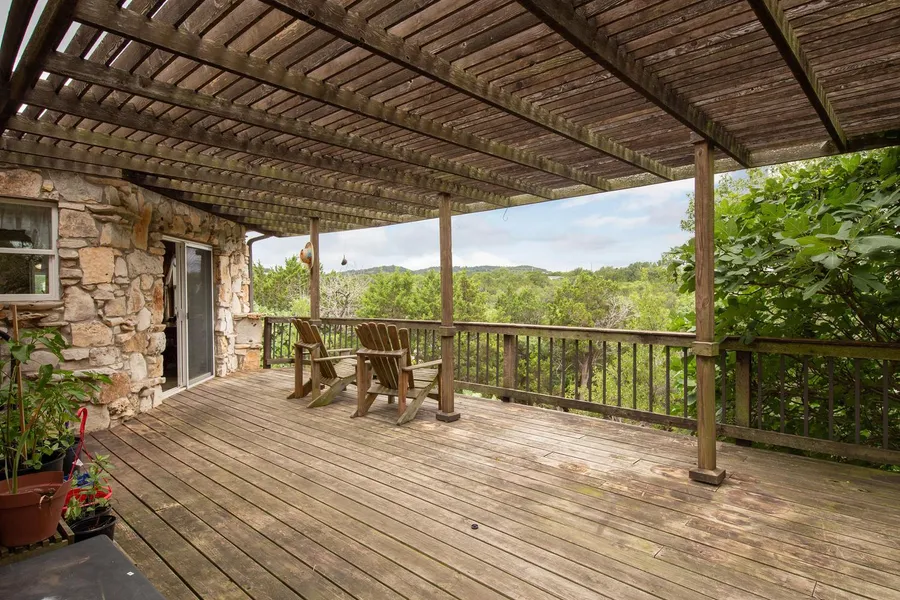 This Texas Hill Country Custom home is 100% limestone & full of charm! The floorplan is situated around a giant fireplace which delivers heat to the entire house. The land consists of 6 beautiful acres, a wet weather creek and gorgeous native landscaping. There is both a well & rainwater collection, a bright sunroom & a 20'x28' deck off the back of the house. The HUGE workshop has a vacuum and compressor system, central heat & even it's own bathroom! Unrestricted!