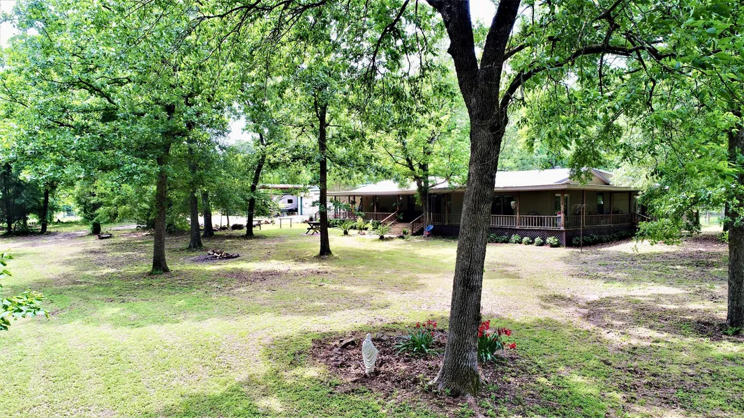 Huge covered porches wrap around over 80% of the home. Built with low maintenance metal and hardiplank exterior, 50-year metal roof, strong, gorgeous porcelain tile, exquisite hardwood paneling, and new paint with custom trim inside! Youll love the stone gas fireplace in the living room as well as the stone fireplace in the master bedroom. The 1,100 sq.ft. master suite has a cozy library sitting area, huge walk-in closet, and a fantastic private bathroom with whirlpool tub and marble shower. The two guest bedrooms share a full bath. The kitchen has lots of custom cabinets, large counter-space and upgraded appliances. The laundry room and mudroom off the kitchen offer a pantry area and great storage. This home is very energy efficient with storm windows and lots of insulation in the attic making very reasonable utility bills, and includes special wiring for a gas generator. There is an alarm system with cameras and wired high-speed internet throughout. Enjoy the 2-car detached garage and workshop with overhead doors, heavy steel beam covered carport and covered area for RV with hookups. Stunning views of the woods and pastures can be seen from the multiple windows throughout the home. This amazing property has beautiful hardwoods and plentiful native grasses in a quiet, peaceful setting, frontage on CR 1815 and 1610, working pens, 3 small barns, completely fenced and cross fenced into 8 different pastures with plumbed water for livestock, a pond, and all-weather creek. Call today!