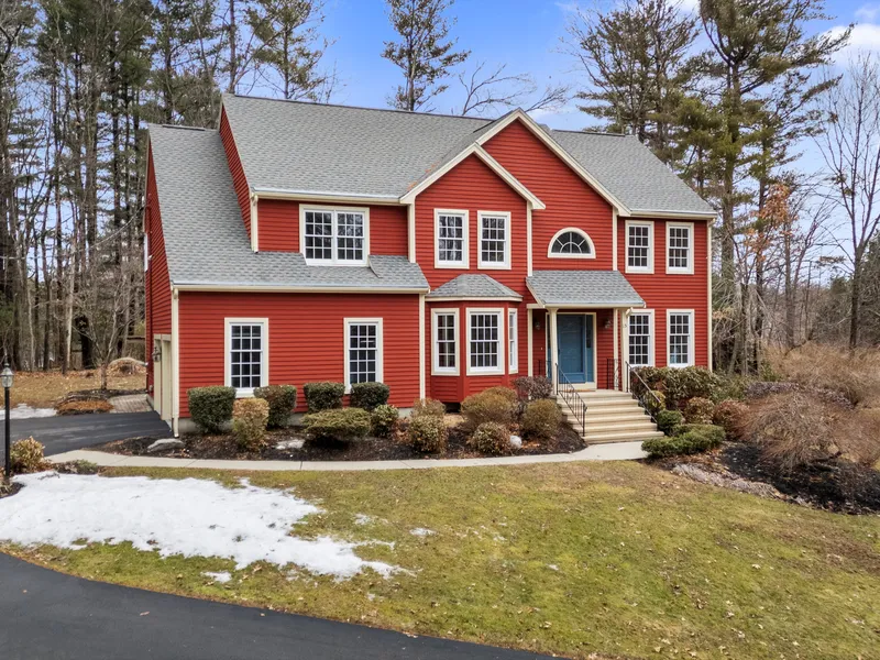 Custom built 4 bedroom, 2.5 bath colonial in The Ridings neighborhood with a highly desirable 'open floor plan' & 2 story entrance way. Formal living room w French doors leads to a home office w/ a view of the private backyard. Upon entering on your left of the Open Staircase is a 17'x11' formal dining room & bay window. The dining room flows into a vaulted ceiling family room w/fireplace(pellet stove) as well as a balcony overlooking & is open to an eat-in fully applianced kitchen. The 1/2 bath & separate laundry rm complete the 1st floor. The Main(master) suite(20x13) w/ an 8'x8' walk-in closet, & a 13x11 full bath w/ jacuzzi tub & separate shower is on the 2nd floor along with 3 good sized bedrooms & a hallway bath. There are beautiful hardwood floors throughout most of the 1st floor, a 2/3 acre private treed lot w/outdoor shed, and a side entry 2 car attached garage. Some of the improvements are a newer roof(2014), & recent furnace, oil tank, driveway, wall ovens & refrigerator.
