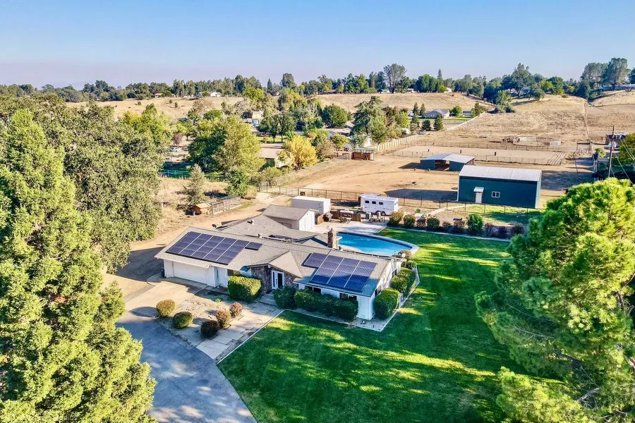 7.59-acre, 1,945-square foot home with 950-square foot in-law unit, pool and spa, shop, barn, arena and solar. Custom-built home with attention to detail this 4 bedroom, 2.5 bath home has been fully remodeled. The kitchen offers an open concept floor plan, stainless steel appliances, large island, pantry, custom cabinetry with granite countertops and a dining area. Enjoy this split floor plan with the primary suite that features a sitting area and a private door to the backyard. Beautiful luxury vinyl floors, cozy pellet stove, vaulted wood ceiling with beams and ceiling fans. Seamless indoor/outdoor living and entertaining to the serene backyard, with a covered patio, mature trees, fire pit area with stamped concrete, in-ground PebbleTec pool with waterfall and spa, hot tub, and spacious concrete decking around the pool with a pool room for storage and a separate garage. This incredible...