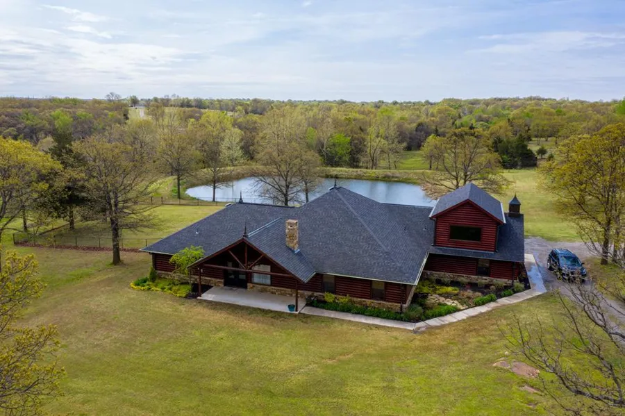 Located south of Bristow and within 40 minutes of Tulsa, this unique, custom-built log home boasts 3,560 square feet with 2 living areas, 5 bedrooms, 3 bathrooms, and a media room, all situated off of a blacktop road on 5 +/- acres. The front entrance is stunning with a custom electric gate and a tree-lined driveway. The main living area features a beautiful rock, wood-burning fireplace, and vaulted, knotty pine ceilings. Flowing seamlessly into the kitchen and dining room you will find French doors leading out to a patio that is complete with everything you need for entertaining. It is perfect for enjoying sunsets, watching the kids play, and grilling out with friends. The large master bedroom includes his and her walk-in closets and an en-suite bath with a separate tub and shower. All of the bedrooms are located on the downstairs level. The spacious second living area features a gas fireplace and could be used as an office or a separate mother-in-law suite. The upstairs media room is complete with a motorized projector screen and bar area. A pond that is perfect for fishing in the evening sets behind the house. The property is fully fenced and a pad is in place for a shop building to be added. This incredible home is a must see! Contact Summer Witty to schedule your private showing.