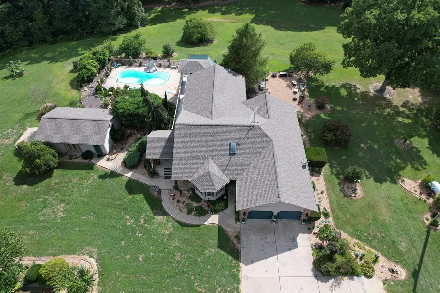 Fully custom home on Highway JJ less than two miles from Interstate 44. This home sits on an immaculate 5.98 +/- acres offering plenty of privacy and convenience to town and the interstate. The home and the 30 x 20 detached shop feature a partial brick front with the balance of the exterior in vinyl siding. There is plenty of space for toys and tools with an attached two-car garage and the 600-square-foot shop. Upon entering the home, it is clear that every detail and finish are second to none. The entryway and kitchen greet you with ceramic tile, GE Monogram appliances, a Sharp under counter microwave, a double oven, custom cabinets, and stone countertops. The living room, with its laminate floors and gas fireplace, also offers vaulted ceilings and plenty of space for the entire family. The large master bedroom on the first floor includes an attached bath with a tub, tv, and electric fireplace. The amenities on the top floor of the home are the tip of the iceberg. Stone steps lead to the finished basement, including a full kitchen, gas fireplace, and two additional bedrooms. The basement has 9 foot ceilings and a half bath accessible from the inside or outside pool area. Stepping out of the walkout basement offers endless entertainment options, including an inground pool that can operate off of chlorine or salt and a large entertainment area equipped with an outdoor projector movie theater. The landscaping and yard are parklike, which leads to the 100 yard shooting range with a berm. The air conditioning unit, roof, guttering, and fascia are all less than two years old. We look forward to showing buyers this gem of a home.