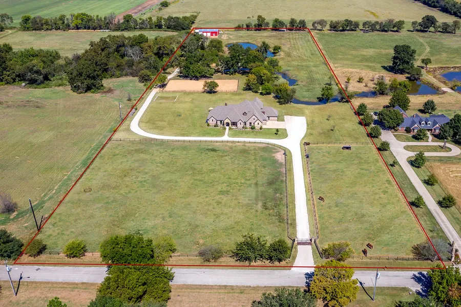 11445 Foutch Road in Pilot Point features an eye-catching custom home with a pool, fenced pastures, pond, creek, and a 2,400 square foot storage building on 10.9 acres.