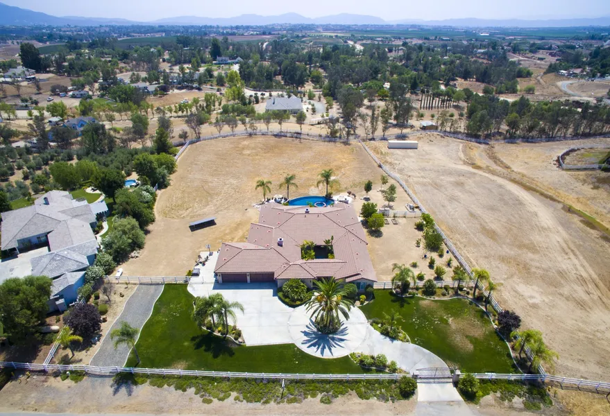 Private 1-story Estate home in Temecula wine country, turn-key home & perfect for entertaining, 4797 sq ft 4 bedrooms-4 1/2 baths w/ private office/ casita or can even be used as another bedroom, creating a 5 bedroom. 10, 11 & 12 ft ceilings gives this home the wow factor. Private court yard w/fireplace the home sits on over 2 1/2 acres, w/a vanishing edge pool & spa, Enter through the private courtyard you can feel the serenity this home offers, 10 ft iron & wood front doors, you enter into the foyer where you find travertine flooring formal living room w/fireplace & French doors over looking the vanishing edge pool & spa. Dining room has 2 sets of French doors opening up to the private courtyard. Gourmet Kitchen with top of the line stainless steel appliances, large island & granite counter tops, built in over sized refrigerator, plenty of cabinet space, butlers area & 2 walk in pantries kitchen is open to the family room with fireplace. Master bedroom is large w/fireplace & seating room, 2 walk in closets, over sized shower, jetted spa tub & dual vanities. The 3 bedrooms have private en-suite bathrooms. Property is fully fenced with an orchard, Large over size deep 4 car garage gives you extra room for play toys or boat. Access area for RV on side of house. Home has fully paid for solar.