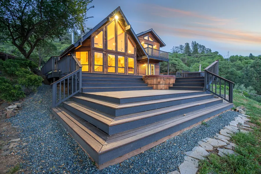 Beautifully restored custom home with interior and exterior recycled old growth Teak, settled on an 18+ acre ag zoned parcel. Deer Creek borders the land along with 2 fully mature fenced orchards with a large variety of fruit trees, concord grape vines and olive trees. Endless opportunities for growing food and homesteading as the property has rights to the NID agricultural water canal. The property has been farmed organically and also boasts two industrial grade green houses with top quality, new soil and irrigation. The home features south facing, floor to ceiling view windows. The master suite upstairs is very spacious which leaves room for an office, gym or your imagination. All lighting has been upgraded to energy efficient LED dimmable lighting. Includes integrated speaker system throughout entire home. The exterior multilevel decks are architecturally designed including a recessed...