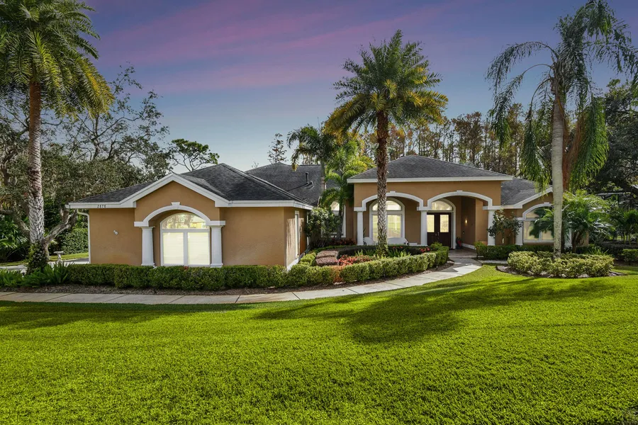In the prestigious Cypress Lakes Estates, this exceptional residence offers a wonderful combination of timeless elegance and unparalleled functionality. On a meticulously manicured 1.17-acre lot, the home exudes a sense of serenity, framed by lush, mature landscaping. Meander the newly constructed Trex boardwalk, leading to an intimate lakeside retreat, ideal for quiet contemplation or enjoying an evening by the fire. A grand travertine-covered front porch beckons you into an expansive formal living room, adorned with double crown molding and soaring 12-foot ceilings, flowing seamlessly into a sophisticated formal dining room. Spanning 4,861 square feet, this spacious, split-floor plan is designed for privacy and gracious living. It features four massive luxurious bedrooms, each with an en-suite bath and custom walk-in closets, offering ultimate comfort and convenience. The primary bedroom is a serene and spacious retreat, designed to offer the ideal blend of comfort and elegance. With soaring ceilings and large windows, it is bathed in natural light, creating a warm and inviting ambiance. A separate sitting area provides an ideal space for relaxation, reading or enjoying a peaceful moment. At the same time, French doors lead directly to the lanai, offering seamless indoor-outdoor living and tranquil views of the lush backyard. The room is generously sized, allowing for a variety of furniture arrangements, and features custom walk-in closets that provide ample storage with a touch of sophistication. The primary bath is a luxurious sanctuary, thoughtfully designed to evoke a spa-like atmosphere. It has been impeccably updated with high-end finishes, including new double vanities with elegant granite countertops and custom cabinetry. The oversized soaking tub, positioned to take in the serene views, invites you to unwind in absolute comfort. A spacious, walk-in shower with sleek modern fixtures and tasteful tile work completes the bath, offering a refreshing and indulgent experience. The gourmet kitchen is a culinary haven, featuring custom wood cabinetry, polished granite countertops, a butler's pantry, a central island and all-new Bosch appliances. The adjacent breakfast nook, framed by a mitered window, invites you to savor picturesque views of the lush, private backyard oasis, which includes a newly updated travertine deck, Pebble-Tec pool and meticulously landscaped tropical grounds. The oversized three-car garage is equipped with updated 8-foot hurricane-rated doors. Further enhancing the home's appeal are a new gas water heater, a state-of-the-art saltwater pool system, and a new pool filter, ensuring luxury living at its finest. Elegantly appointed throughout, the home boasts new Brazilian cherry wood floors in select areas, a newly installed front door and energy-efficient LED lighting throughout. The irrigation system, drawn from the tranquil lake, nourishes the lush landscaping, while beautiful transom windows infuse every room with natural light. Additionally, the home has been thoughtfully converted to natural gas from propane, adding efficiency and modern convenience. This home offers a rare opportunity to own a distinguished property, ideally within a mile of two top-rated schools, combining sophisticated living with the utmost in luxury and convenience.