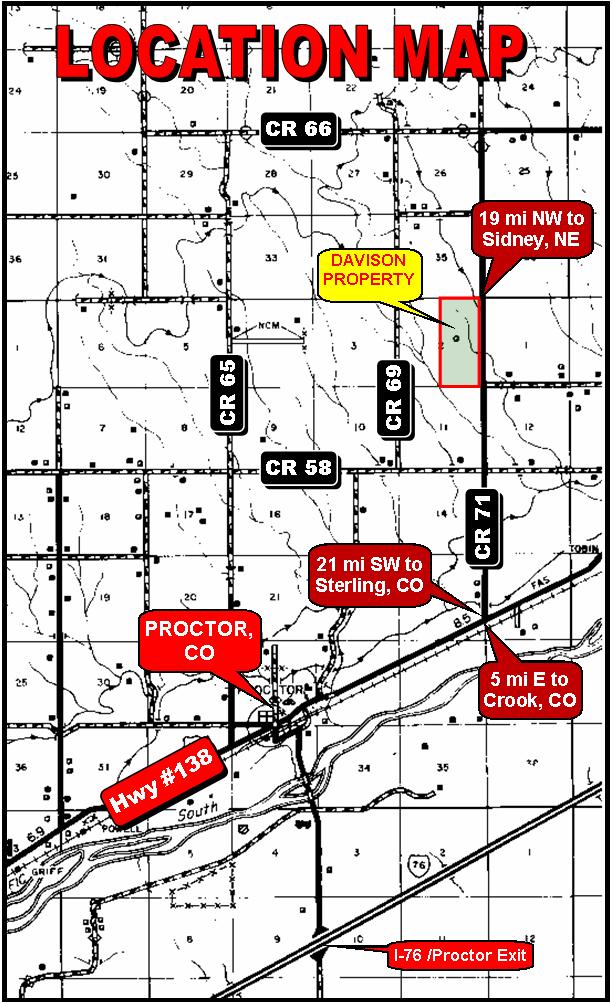 Research Parcel InformationFrom Sterling, CO, 21 mi NE on Hwy #138 to CR 71, N 3 mi on CR 71 to SE corner of the property; From Sidney, 4 mi S on RD 113 to RD 8, 3 mi E on RD 8 to RD 121, 3 mi S on RD 121 to CO/NE state line, jog E then S 8.5 mi on CR 71 to NE corner of property; From Crook, 5 mi W on Hwy #138 to CR 71, N 3 mi on CR 71 to SE corner of the property.