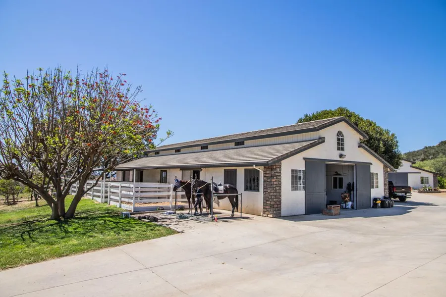 Private equestrian estate with stately trees, panoramic views and gated entry. Located west of I-15 in one of De Luzs most beautiful and easily accessible areas. Improvements include a single level ranch style main residence with lovely pool, 2 bedroom guest house, gorgeous barn with 8 oversized stalls set up to capture cool breezes, large hay barn with additional stalls, irrigated grass pastures and an arena with footing suitable for high level dressage or jumping.