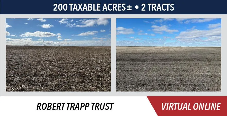 The Trapp farm will be sold on a price per acre basis, based on taxable acres. The tracts will be offered through the marketing method of Buyers Choice, whereas the high bidder can elect either tract for their high bid. If the high bidder does not elect all offered tracts, then the remaining tract will be sold on a price per acre basis. The tracts will NOT be offered in their entirety at the conclusion of the auction.