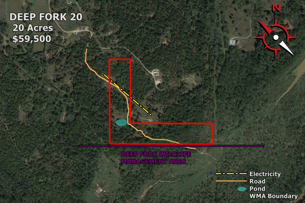 Attention hunters; Deep Fork 20 is a chance to get your own private access to 11,682 acres of state managed hunting land. This is a diverse 20 acres that borders the Deep Fork Wildlife Management Area which provides opportunities for hunting deer, turkey, quail, dove and waterfowl. Best of all, the WMA plants food plots every year so you dont have to!