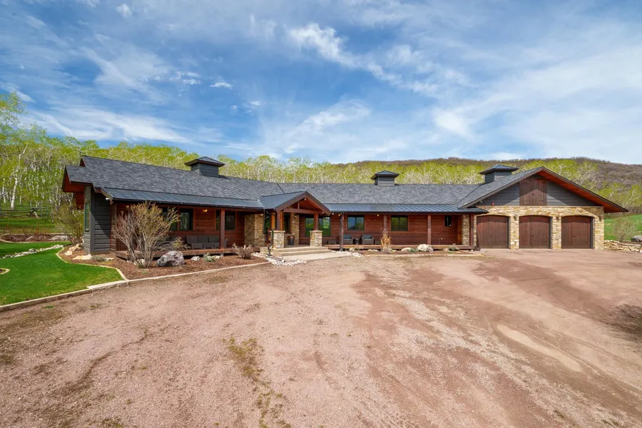 Located in the south valley of Steamboat Springs, this custom-built home rests on 38 acres, surrounded by a picturesque aspen grove teeming with birds and wildlife year-round. Thoughtfully designed, the intelligent floorplan separates the master wing and guest wing with a central great room, offering both privacy and easy gathering spaces. The kitchen opens to the living and dining areas, where impressive hand-hewn beams highlight the architectural elegance of the vaulted ceilings. Outfitted with premium appliances, custom cabinetry, granite counters, a large pantry, and bar seating, the kitchen is ideal for chef-worthy cooking and entertaining. The dining area comfortably accommodates a large table and buffet, while the living room features a stone fireplace with a striking antique mantel. The master wing provides convenient access to the laundry room and a private office. The master suite enjoys views of the landscaped yard and surrounding aspens, and includes a five-piece bath with a steam shower, jetted tub, double sinks, separate water closet, and an adjacent walk-in closet with custom shelving and ample hanging space. The guest wing offers a spacious den (currently used as a bunk room), a hall powder room, and two inviting guest suites, each with its own en-suite bath. A mudroom with built-in storage connects to the oversized three-car garage, complete with fresh epoxy flooring. Outdoor living is as well-designed as the interior, featuring a wide deck that spans the length of the home, a beautiful back deck, and a professionally landscaped yard with an irrigation system. Additional improvements include a 5-bay enclosed equipment building and a versatile barn with finished space for recreational vehicles and room to customize for horses. Water is provided by a neighboring central system, and a pond is fed by a decreed spring. Set at the end of the road in a private valley with no covenants, the property offers rare seclusion just 12 miles from Steamboat Springs.