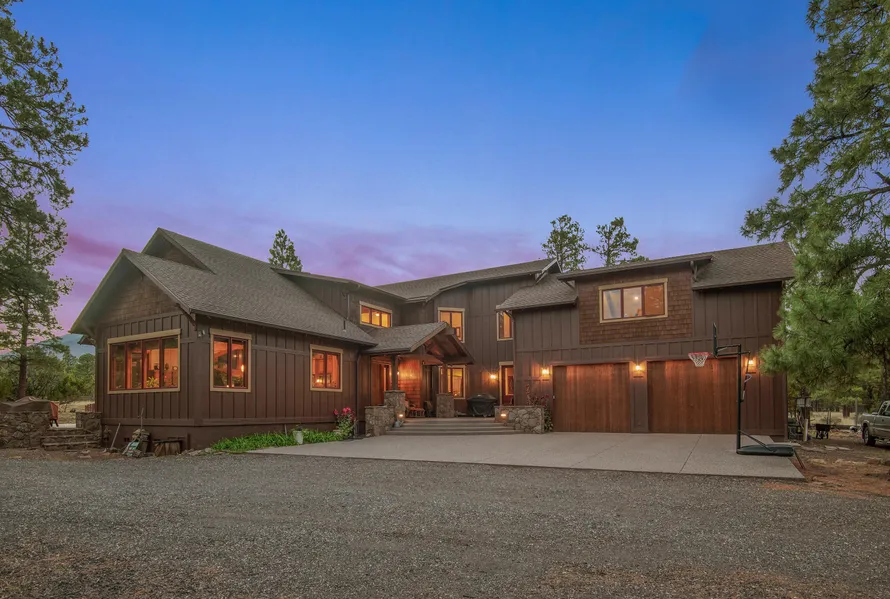 Tucked amidst towering Ponderosa pines on a 2.75-acre lot in McCann Estates, this delightful Flagstaff timber frame style estate offers the peaceful country atmosphere you have been searching for! As you open the custom white oak entry door, an impeccably designed interior displays impressive craftsmanship throughout, from the gorgeous millwork and beautiful rustic hickory plank flooring to the solid fir beams on the high vaulted ceilings. A 44 Fireplace Xtrordinair with a floor-to-ceiling native Malapai rock surround warms the living room while walls of Sierra Pacific double-pane, low-E windows frame breathtaking views that greet you at every turn. An antler chandelier casts an elegant glow in the dining room, and glass sliders with access to the patio.