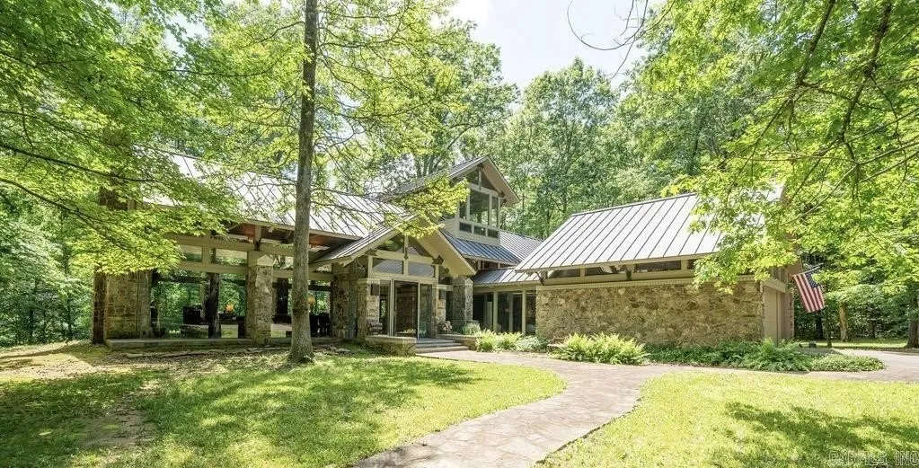 Located on the bank of Little Red River (home of the world record wild brown trout) in the Ozark Mountain foothills is an all glass mid century style home with spaces for solitude and socializing. Find total privacy on 12.9 wooded acres with approximately 700 feet of river frontage. The floor to ceiling glass walls provide a window to nature as deer, wild turkeys, foxes and others visit the surroundings daily. The gourmet kitchen opens to the great room with its large fireplace and views of the outdoors. The primary bedroom suite has two private baths, a fireplace , large walk-in closet, private courtyard. The second floor has a spacious guest bedroom, a bunk room with built-ins, and an exercise room hidden behind a bookshelf wall. The crow's nest office is above it all with views in all directions. A short walk to the 2 stall boat dock takes you to world class fishing for rainbow, brook, cutthroat and wild brown trout! A conservation easement across the river ensures unobstructed views of the natural setting in perpetuity. Designed by award winning architect Gene Levy with Cromwell Architects Engineers, custom built by Roberson Builders, everything about this home is remarkable.