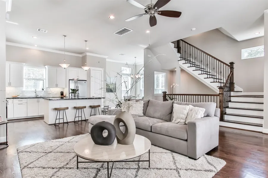 Beautiful recent construction, free-standing, home located on a quiet street. Desirable end unit that has a side yard for pets or gathering outdoors. One bedroom is on the first level has a full bath with access to the yard. The kitchen is open to the dining and living on the second floor and has great storage, island, and a beverage cooler. The primary and one of the secondary bedrooms are on the top level. Primary bedroom is large with ample closet space and beautiful bath with double sinks and separate shower and bath Ready for immediate move in. Within walking distance to shopping, coffee and restaurants.