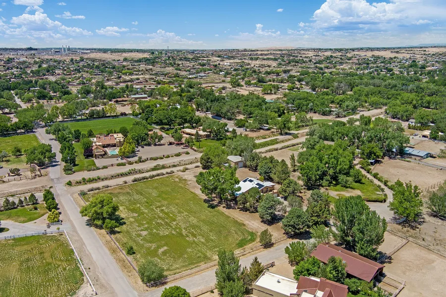 Greenbelt 2.4 acre home in the southside of Corrales. This property has been updated with a farmhouse feeling of comfort and serenity. Beautiful living starts with the entry. This house invites you in to enjoy the Lux vinyl plank flooring and new iron stair railing. Downstairs offers 2 living areas, dining room, open kitchen with lots of counter space. Enjoy a guest room and 3/4 bath downstairs, for multi-gen living. Upstairs you will find a large primary suite with an attached office/workout area and balcony. Two additional guest beds and hall bath. Enjoy the peaceful backyard and patio or raise chickens, grow crops and imagine your dream. Large metal building is 1.5 stories high and 30ft X 40ft. Enjoy refrigerated AC with the paid-off solar system to reduce your electric bills.