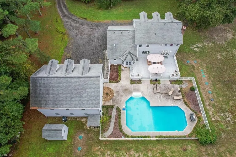 Welcome to 1901 Prince Edward Drive in Chesapeake, VA! This property offers incredible space, privacy, and versatility, situated on a large 2 acre wooded lot with an updated septic system and a beautiful saltwater pool. The main home features 4 bedrooms, 3 baths, and 2,667 sq ft with a 2-car garage and abundant storage. The kitchen is a true showpiece, showcasing white cabinetry with glass accents, expansive countertops, designer pendant lighting, and a large bay window overlooking the pool and serene backyard. The living area flows seamlessly with custom built-ins and abundant natural light. Upstairs you’ll find spacious bedrooms, a versatile FROG, and a generous primary suite with a beautifully appointed bath. Outside, enjoy the expansive deck, lush yard, and detached guest house above the 3 car garage with 2 bedrooms, 1 bathroom and full kitchen—great for in-laws, guests, or rental potential. A rare combination of comfort, style, and space in the heart of Chesapeake!
