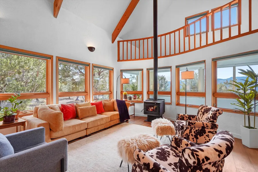 NOW OFFERED AT $589,000--EXCEPTIONAL VALUE FOR PRIVATE MOUNTAIN RETREAT! Welcome to your tranquil escape in gated Fox Hills of Sandia Park. Nestled on 5 secluded acres, this updated contemporary home blends serenity and convenience with private trail access and nearby national forest hiking. Light, open floor plan features spacious kitchen, cozy lofts, sunroom with panoramic views. Upgrades include new high-end flooring, remodeled primary bath, new countertops, backsplash, fixtures. Comfort year-round with radiant floor heat, backup generator, Navien combi-unit, water pressure pump, and wood-burning stove. Step onto new deck for morning coffee or stargazing. Also includes detached oversized garage, chicken coop, and small barn. This peaceful chalet-like home is a rare find! Call today!