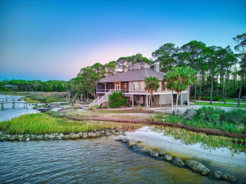 Custom Built, BAY FRONT home with private dock. NO MARSH to wade through. Excellent fishing! Reds and trout caught right off the dock! Top of the line appliances including: WOLF gas range, NEW refrigerator, BOSCH dishwasher, leather topped granite kitchen countertops. On demand water heater, and AC installed 2018. New septic blower, pump and control panel in 2020. NEW 2025 DRAIN FIELD. Brilliant Pine flooring and ceiling add to the beauty of this home. The fireplace and comfortable High End furnishings as well as the view of the BAY, make the perfect setting to watch sunsets. The Florida Room off the master bedroom adds to the privacy of the Master Suite. It shares an entrance to the attached BAY SIDE fully screened in porch with a extra long dining table, comfortable sitting area and a porch swing. With EXCELLENT VIEWS and ENTERTAINING this bay side porch has a kitchen window pass through, great for food and other needed culinary items. Wrap around hurricane shutters offer the protection needed for storms. The attached, drive through garage is a great place to store your boat, golf cart and all of your recreation items. NEW rip rap along the entire bay side shoreline. Sand beach has been added behind the entire rip rap. The outdoor shower and a 1/2 bathroom are easily accessible on ground level. Take the NEW Lift/ Elevator up to the street side porch or either of the three stairways to reach the one level living space. Handicap accessible. Owners stay in the house several weeks throughout the year. INVESTORS - GREAT RENTAL!! As of 9/26/25, 2025 income - $111207.57. Community offers: pickleball, tennis, two swimming pools, club house, work out/weight room, bike path, air strip, security... Great opportunity to own this waterfront one of a kind, GORGEOUS, beautifully staged, FULLY FURNISHED home in the Plantation, on St. George Island. If uncompromising, High End Quality, is important to you, this exquisite home is made for you!