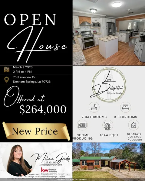 One address, TWO HOMES with built-in income in the heart of where Denham Springs comes alive—welcome to life on Lakeview Drive. This charming and versatile cottage is perfectly positioned and centrally located offering effortless access to Antique Village, Bass Pro Shops, Juban Road shopping and dining, local restaurants, and quick connectivity to I-12—making daily living both convenient and enjoyable. Inside, you’ll find an inviting open-concept layout across this thoughtfully designed living space. The kitchen is the heart of the home, showcasing a granite island and countertops, decorative backsplash, breakfast bar, gas range/oven, and elegant crown molding. It flows seamlessly into the living and dining areas, where wood flooring and crown molding create a warm, cohesive space ideal for entertaining or relaxing. The bedroom layouts offer both privacy and comfort, with wood flooring t...