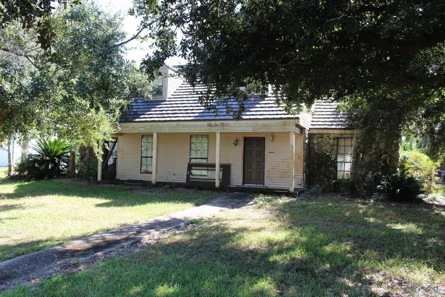 4 Bedroom, 2.5 bath home sits upon 2 lots (each 104 x 160). Driveway to rear of lot, boat/RV access backyard. 3 bedrooms upstairs, 1 bedroom with bathroom downstairs. Beautiful, large oak tree shaded yard. Spacious kitchen with attached breakfast area with access to rear back covered patio, plus formal dining room with exit to covered patio in front of home. Spacious Living Room. Foyer with stairwell to second floor. Front porch. Rear covered patio. Spacious backyard overlooks fields. Home is being sold "AS IS" with storm damage to exterior and interior.