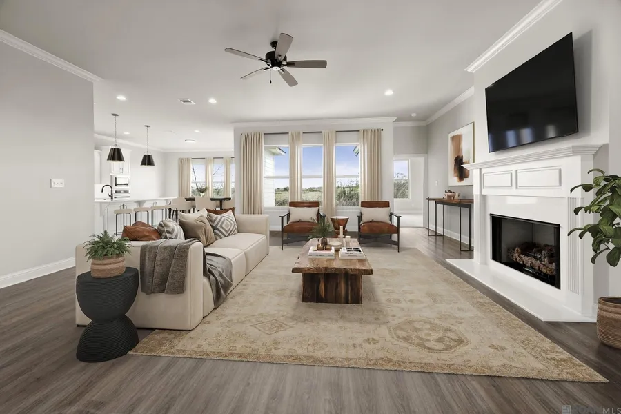 Introducing the Melrose floor plan by Level Homes to St. John Place! This home not only has function, but style as well!!! Our Melrose floor plan features a grand foyer leading into the formal dining and large open great room. The great room is centered around a vent-less gas log fireplace with views of the large, covered patio and backyard. Beautiful gourmet kitchen features stainless steel appliances including a 36" 5 burner gas cooktop with single wall oven and built-in microwave, 3 cm Pure White quartz countertops, white subway tile backsplash, painted custom cabinetry with under cabinet lighting and 5" hardware pulls, large center island with sink and overhanging pendant lights, matte black plumbing fixtures and a walk-in corner pantry. Large master features a spa-like bath with custom tiled shower with seamless shower door and separate soaker tub, framed mirrors, his and her vaniti...