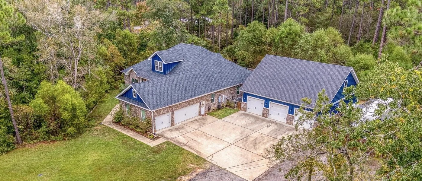 Looking for a home with land? This one is it! This 3,500 sq ft brick home, built in 2019, sits on 1.4 acres across from the bay with no HOA and plenty of indoor space to entertain. The property includes a 6-car garage setup--an attached climate-controlled 3-car garage and a detached 3-car garage with full bath, ample space for multigenerational living. Inside, you'll find an open-concept floor plan with LVP flooring in main living areas, new carpet in all bedrooms, granite in the kitchen and baths, stainless steel appliances, walk in pantry, tankless water heater and wood burning fireplace. The home offers 5 bedrooms and 5 and 1/2 baths, including two ensuites --both with direct access to the covered back porch.