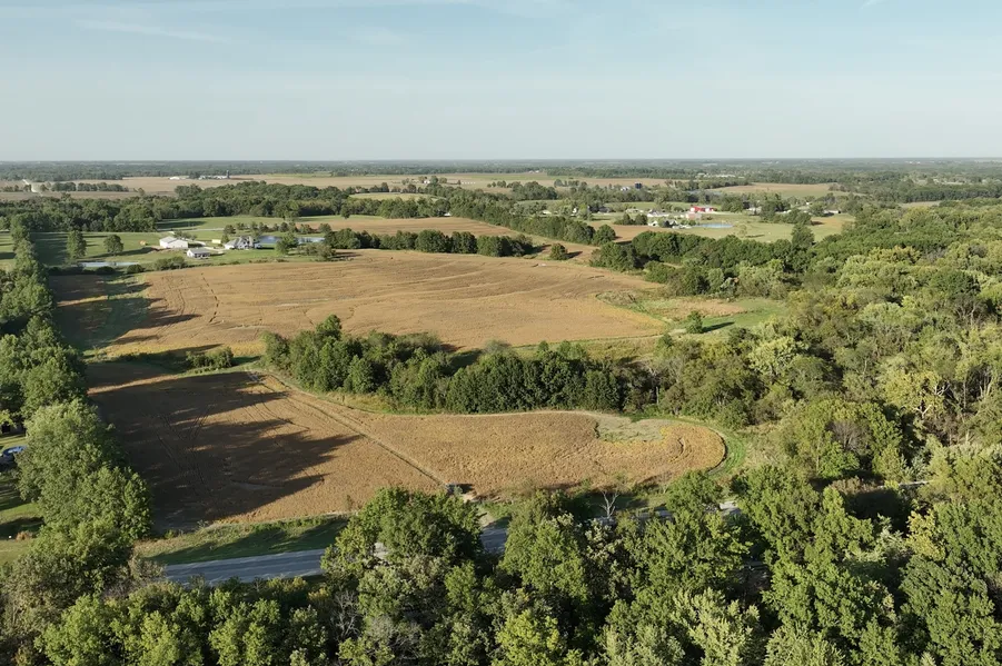 The land features gently rolling terrain, providing several excellent building sites, whether you envision a private residence, a business venture, or a mix of both. The property offers stunning panoramic views of the surrounding landscape, including a neighboring lake, rolling timber, and expansive agricultural fields, creating an attractive backdrop for future development