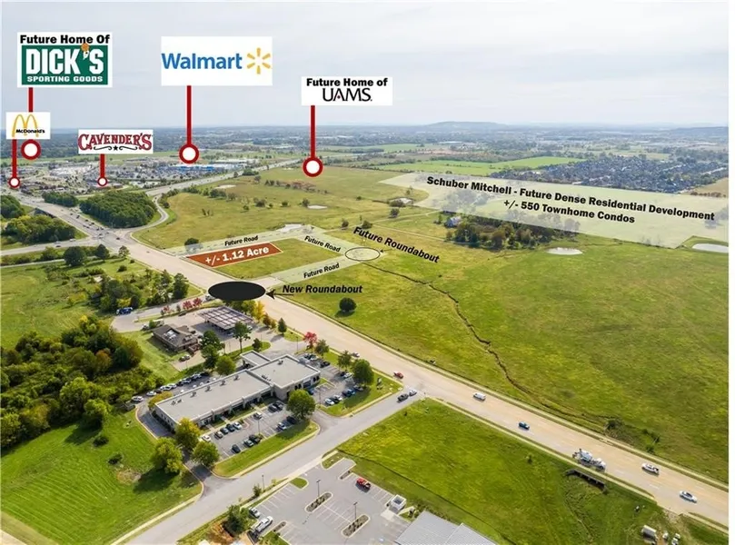 access are subject to change and can be tailored to suit the end user. Surrounded by top national retailers —Walmart, Starbucks, Chick-fil-A, McDonald's, Academy, Ross, and a future Dick's Sporting Goods—this location is ideal for high-traffic commercial use. Traffic counts reach +/- 110K VPD on I-49 and 18K on W Pleasant Grove Rd. Perfect for restaurants, QSRs, pharmacies, coffee shops, banks, and general retail. Just 2.5 miles to Top Golf and Walmart AMP, 10 minutes to Walmart’s new HQ, and under 20 minutes to XNA. UAMS is building next door, and Schuber Mitchell Homes plans +/- 520 ...