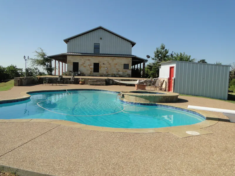 This secluded property is located just minutes away from Interstate 45 between Dallas and Houston in the peaceful town of Dew, Texas. This stunning 6 bedroom 2.5 bath stone home sits high atop of "Burleson Hill" which was monumented in 1919 by the U.S. Coast Geodic Survey with an elevation of 608 feet. "Burleson Hill" has since been recognized as the highest point of elevation in Freestone County. This is a Texas home with a Colorado view that is breathtaking! This 4200 sq ft home has 16 acres with the opportunity to purchase 170 acres or any amount in between. The additional acreage has many outbuildings, barns, including a 45 X 60 shop with an office, steel working pens and numerous ponds. This unique one of a kind home has loads of personal touches; cedar and stone accents throughout, custom made cedar kitchen cabinets, antique corrugated metal ceilings, just to name a few! The...