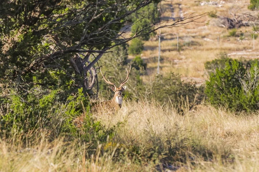 WILDLIFE. For those who love to hunt, this ranch is set up and ready to go. About 375 acres of the ranch are high-fenced and well-managed. Equipped with five (5) gun blinds, two (2) winch operated crank-up corn feeders, five (5) stand-and-fill protein feeders, and a dedicated water well that pumps to troughs and the stock pond keeping the wildlife healthy, hydrated and active year-round. Within the high-fenced area, is an impressive mix of game including Red Lechwe, Gemsbok, Axis, Blackbuck, Fallow, Whitetail, Turkey, Dove, and Quail. The low-fenced portion of the ranch, spanning approximately 102 acres, is well set up for easy and enjoyable hunting with two (2) gun blinds, a winch operated crank-up corn feeder, two (2) stand-and-fill protein feeders, and a water well that supplies three (3) troughs. Wildlife that is seen consistently throughout the low-fenced area include whitetail, elk, sika, hogs, turkey, quail, and dove. Occasionally this area is known for surprise appearances from fallow, axis, mouflon, gemsbok, or aoudad. Diamond H Ranch has the kind of setup that keeps every hunt or weekend outing exciting, whether you are after big game or simply enjoying the variety of animals that frequent the place.