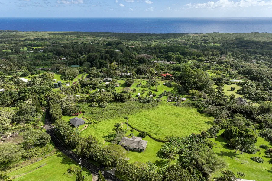The 4.6 acre property, located on a quiet cul de sac in the highly desirable Hana agricultural park, includes the 1600 s. f. 3 bedroom/ 2 bath main residence with a 500 s. f. covered lanai and a 500 s. f. garage. Separate from the main residence is the 2 bedroom, 1 bath guest cottage of 720 s. f. with a 240 s. f. lanai, which is accessed by a separate and private driveway.