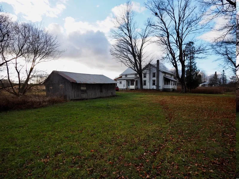 There is a front porch (open) and a side porch (enclosed) and a back addition more than large enough to house a car. Behind it is an attached woodshed (15.5x28) and the 3-holer the Amish used way back when they owned the place. You never know, it might be handy if there is a power outage. The kitchen is large, with ceramic tile floors (both bathrooms have tile floors too) it has epoxied walnut countertops (gorgeous), a canning sink + the dish sink. A matching free-standing cabinet is in the dining room, along with a hi tech oxygen-limiting wood cookstove. Floors there are oak. The front part of the living room has the original wide plank floors as does a large downstairs bedroom. The living rooms ceiling is also the same kind of plank, unusual. There is a modern wood stove located there. In the downstairs bath is a large custom-made storage cabinet, which matches the interior doors. The final first floor room is a walk-in & walk-about pantry.