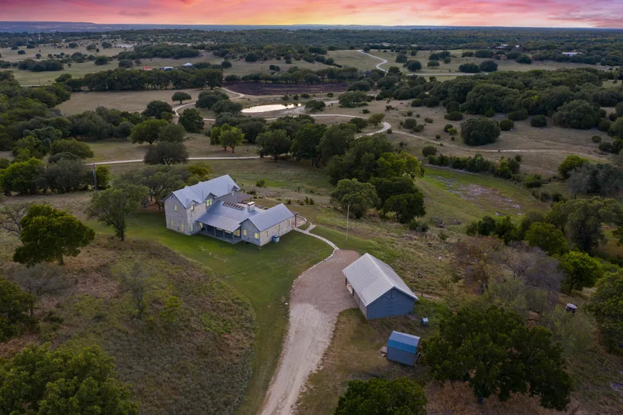 The two-story main house is well-maintained and constructed of native stone and cedar siding, with a metal roof. This 4-5-bedroom, 4 bath home totals approximately 3,360 sf and was built in 1990. The long great room on the first floor has a vaulted, exposed beam ceiling with skylights, stone fireplace and overlooked by a kitchen with center island and granite counter tops and all electric appliances. There is a septic system for waste.