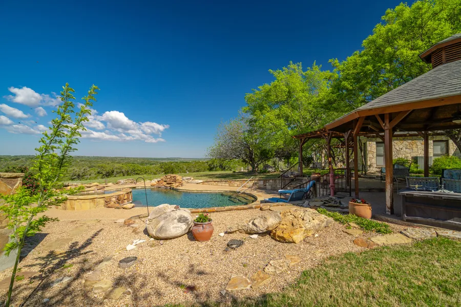 A ranch-style home sits on a high hill with a 180-degree view of the surrounding countryside. The home was built in 2001; it is 2,866sq. ft., with three bedrooms and two bathrooms. The kitchen, living room, and dining room sit in the middle of the home, with two bedrooms, an office on one wing, and the master bedroom on the opposite side of the home. The backyard is a wonderful oasis with a pool, pergola, poolside cabana, and dog run. Next to the home sits a 2,000 sq. Ft., barn with 1,000 sq. Foot overhang on the side for storing additional equipment and implements.