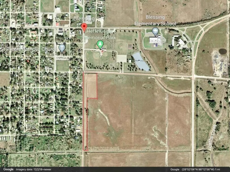7 ACRES LOCATED IN DOWNTOWN BLESSING AREA. POSITIONED AT THE CORNER OF 12TH AND AVENUE C. HEFFELFINGER MEMORIAL PARK IS LOCATED IMMEDIATELY ACROSS THE STREET FROM PROPERTY. EASY ACCESSIBILITY TO DOWNTOWN BLESSING/SHOPPING/LOCAL SCHOOLS. THE CITIES OF EL CAMPO, BAY CITY, PALACIOS AND MATAGORDA ARE A QUICK TRIP FROM BLESSING. BUYER/BUYERS AGENT ARE RESPONSIBLE FOR VERIFYING BUILDING RESTRICTIONS, ACCESS TO UTILITIES AND EXEMPTIONS BEFORE PURCHASE.