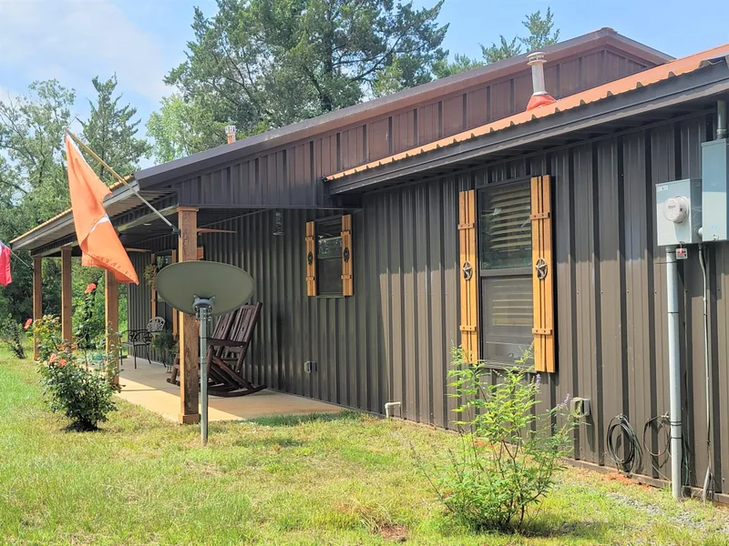 Wonderful Rural Setting! This 2018 All metal home home that sits to the back of the land with an oversized 2 car garage and a covered 15x15 back patio just off of the master bedroom, with a 12x21 storage building setting on 3.55 acres! The home has 2 bedrooms, each with a private bath, and has 1276 sq. ft. of living area. The garage is fully insulated and floored above for storage, making this area a possibility for a large den. The home has stained floors throughout, custom blinds, insulated windows, and comes with the refrigerator and gas stove.