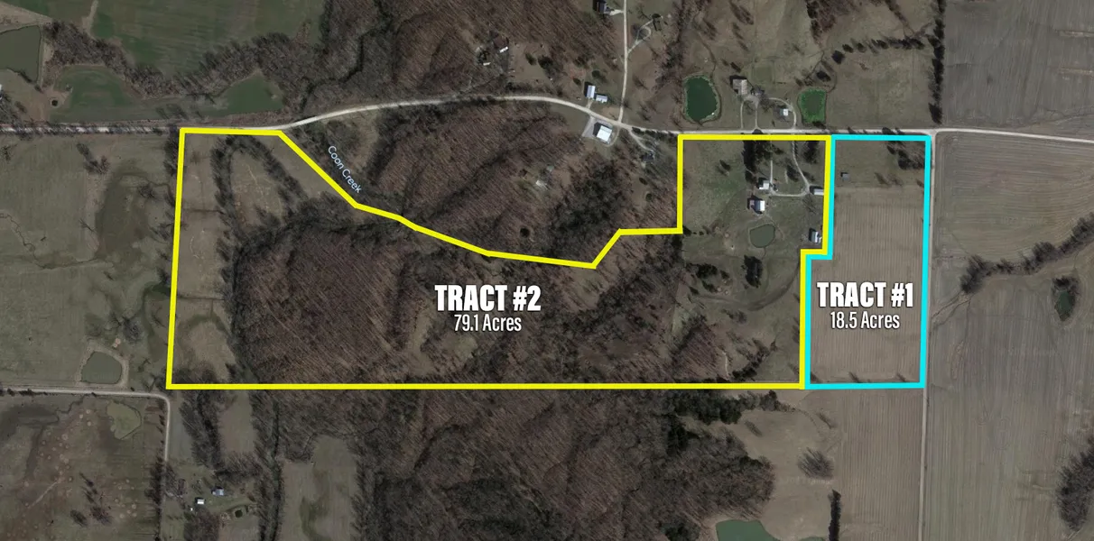 TRACT 2: 79.1 acres of rolling pasture/timber ground with excellent hunting Farm has loads of quality improvements to include nice modern 30x54 with two 12 roll up doors, concrete floor * Enclosed 10x60Silo style storage building * 26x54 Pole/hay barn * 50x74 Hay/Livestock barn converted to open storage w/ lean tos * Modern 30x40 pole barn with cattle working encloser in rear * Farm has cattle waters in several locations with modern electric pond pump & pump house * Farm is pretty well timber & pasture * Creek meanders through the property and several nice trails allow access to a majority of the property, acreage to the west of the creek is accessible from the county road * Great place to build a new home that would be surrounded by quality improvements, a once in a lifetime opportunity!
