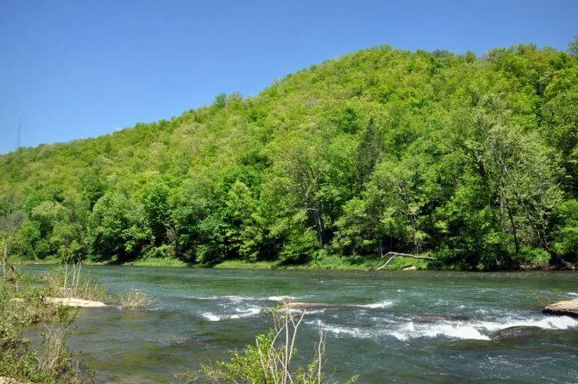 This 12.13-acre (+/-) parcel on the river at Duncans Landing includes a cleared homesite area fronting Hillside Bluffs Road and a large area of forested slopes that descend to the river downstream of Duncans Rock. Several footpaths and old trails follow the contour across the property, providing access to the banks and remote wooded scree. A small apple orchard near the homesite is juxtaposed with the forest of laurels and hardwoods filled with woodland wildflowers that blossom brightly in the spring.