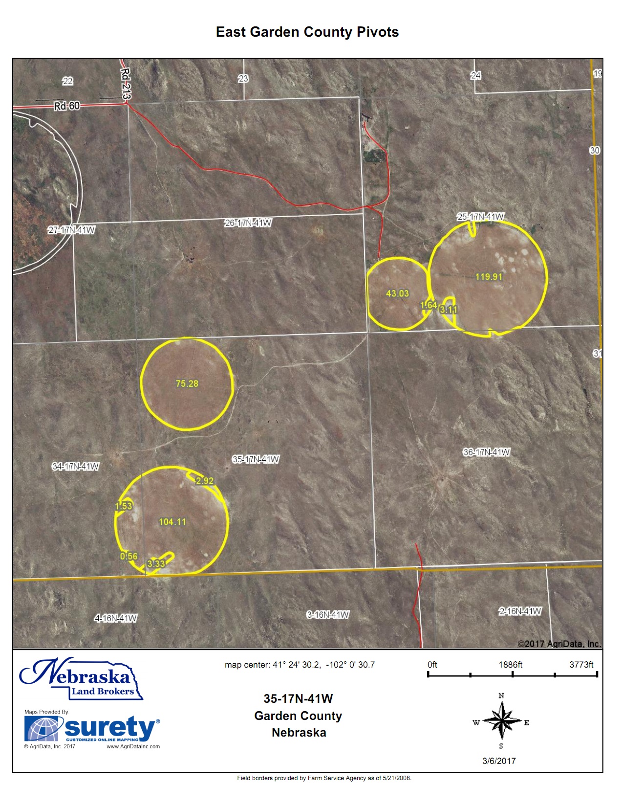 SUMMARY: Located in the North Platte NRD this farm includes 4 electric powered Lockwood pivots. 2 of the wells include Johnston turbine irrigation pumps and 2 wells include electric submersible irrigation pumps. The cropland consists of 100% sand and does have some limited roll to the terrain. This farm has seen limited use in the last 2 years. The cropping has consisted of rye and millet for hay. According to the Seller the 4 fields have little difference in production. Access to the cropland is granted through an access easement and the owner of the pasture does retain an access through the west side of the pivots for access to the west pastures. There are electric submersible wells in the neighbors pastures that serve stock tanks for grazing. An arrangement for stock water may be negotiated.