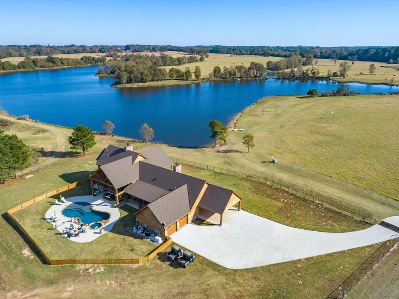 Fully Furnished East Texas Game & Cattle Ranch with 1,146 acres of prime, picture perfect land including a 30 acre lake, 14 small lakes/ponds & a creek! 3 1/2 miles of road frontage on 3 county roads & 1 FM road. 2020 built 5BD/6.5BA home meticulouslydesigned for entertaining & function. Ultimate Lodge Style home features fabulous great room, open concept with stone FP, antler chandeliers, gorgeous bar & gourmet kitchen featuring WOLF range & SS appliances. Split primary in suite has stacked stone FP & spa like bath with fabulous shower & mosaic tile soaking tub. Spacious guest bedrooms have private bathrooms. Oversized 2 car climate controlled garage with walk in cooler plus 2 car carport. Outdoor amenities include heated salt water pool with spa, water feature & outside grill. 3/2 brick + a 2/2 mobile home on property with separate entriesfrom another county road. Shop, barn & working pens. 1 1/2 hours east of Dallas - DFW. Less than 30 minutes to Tyler.