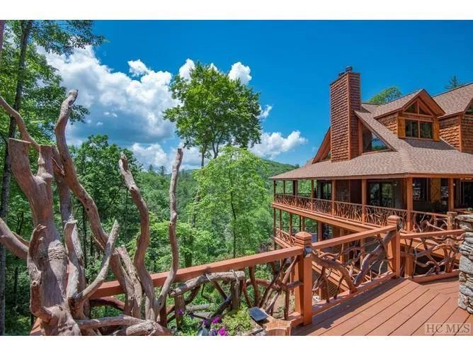 From the Highlands of Europe to Highlands North Carolina. The Story Book Manor provides livable elegance that is casual yet timeless. Luminous and fresh, the manor is refined rustic, opulent, yet a casual home that celebrates the look of natural wood bathed in sunshine. Artfully done inlays scrolled from natures bounty. exuberant shapes in an understated scale create a livable resort, feeling suitable for homes with an unpretentious casual elegance. The light caramel latte color, with organic details naturally present in the wood. The home combines architectural details, with more rustic timber- frame elements, creating a Story Book Manor Home. Its reminiscent influences of charming European Village,which provides a template to embellish in the imagination of your surroundings. The Home is surrounded by landscaped gardens, babbling brooks, meandering trails, and beautiful vistas. Enter the property through a pair of stone pillars and cross a boardwalk bridge that is elevated over the lush gardens below. Once inside, you find the native stone fireplace that soars over 20 feet from the floor to ceiling and the light streaming in through windows set high above the grand living room. The kitchen is outfitted with professional grade equipment and room for multiple cooks. On the main living level you will also find one of the two master suites that affords easy access to the kitchen and living areas. Ascend the grand staircase to the upper level library that looks over the great room you will also find the second master suite. This suite includes a large setting area and private covered balcony that affords a tremendous view over the property. Below the main level is the guest level complete with guest living room and another native stone fireplace. Something special awaits you in the terrace level where you will find a private Spa/Fitness area with large windows and and a sunken 5-6 person spa. Access the guest cottage and garage from the main level boardwalk.