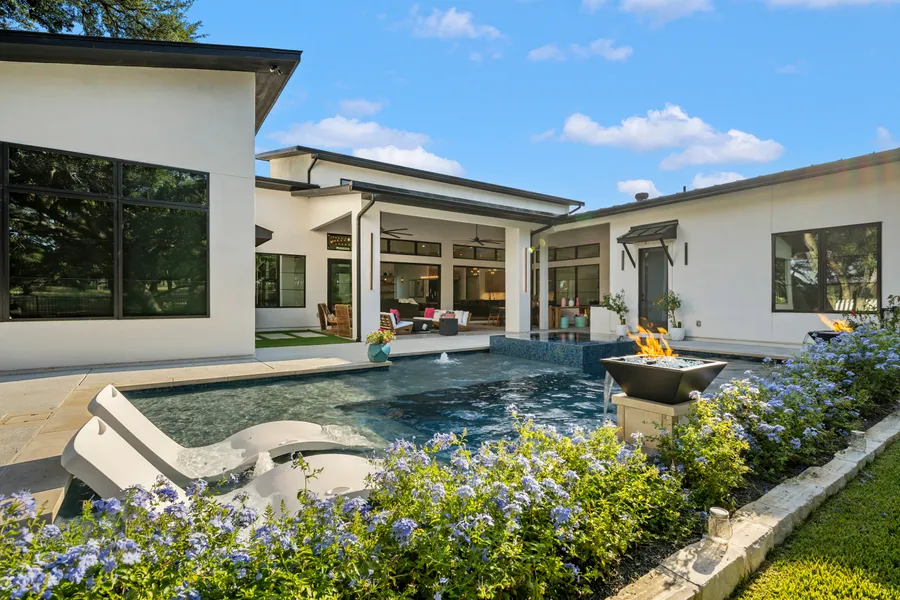 Exquisite and custom-built, this one-story estate sits on a sprawling 1.18-acre lot adorned with majestic heritage oak trees in the exclusive gated community of Belle Oaks Ranch. Designed with the sophistication of a luxury parade home, this residence showcases ultra high-end finishes, meticulous craftsmanship, and state-of-the-art amenities throughout. Step through a modern pivot front door into an expansive open-concept living space featuring soaring 26-foot ceilings and dramatic volume. Dual panoramic sliding doors blur the line between indoor and outdoor living, opening onto an expansive patio area-both covered and uncovered-complete with a fully equipped designer outdoor kitchen finished to the same impeccable standards as the interior. The chef's kitchen is a showstopper, featuring 54" upper cabinetry, quartz countertops and backsplash, and a striking leathered granite waterfall island. Premium Fisher & Paykel appliances include a two-oven gas range with oversized griddle, dual dishwasher drawers, and a built-in refrigeration wall with refrigerator, wine fridge, and freezer. A separate bar area with its own dishwasher drawer and nugget ice maker adds a perfect touch for entertaining. The walk-in pantry offers exceptional functionality with built-in cabinetry, shelving, prep counter, microwave, and warming drawer. Nearby, the mudroom and oversized laundry room add daily convenience with a center island, built-in desk, and space for a secondary refrigerator. The luxurious primary suite is a serene retreat with private outdoor access, blackout shades, and a spa-like bathroom featuring a freestanding tub, oversized walk-in shower, and a jaw-dropping, two-story 500 sq. ft. closet with custom built-ins and a vanity. Secondary bedrooms are generously sized, each offering en suite bathrooms and walk-in closets. A dedicated office provides an ideal space for work or study. The backyard is a private oasis, professionally landscaped and designed for resort-style relaxation. Enjoy a custom pool and spa with dual sun shelves and water features, all surrounded by lush greenery. A circular drive, oversized driveway, and 3-car garage with 8-foot doors and AC'd storage/hobby room offer ample parking and functionality. Built for comfort and efficiency, the home features full foam insulation and a drip irrigation system for low utility costs. Belle Oaks Ranch amenities include a clubhouse, pool, playground, tennis court, pickleball, and basketball courts-just minutes away.