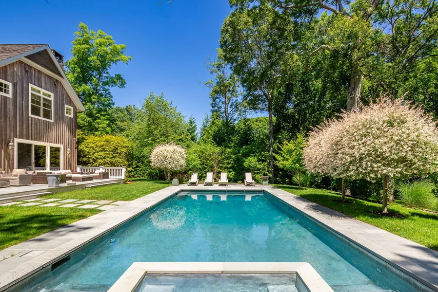 Situated on a tranquil private path, this sophisticated six-bedroom home offers luxurious living spaces and serves as a haven for outdoor enthusiasts. Surrounded by pristine woodland and located across from Trout Pond with its scenic hiking trails and excellent fishing spots, this residence is ideally positioned between Sag Harbor Village, Bridgehampton, and Southampton. A world-class marina is just a stone's throw away. Two renowned golf courses and a National Wildlife Preserve is less than a mile away. Spanning 7,000 square feet across three levels, the home provides ample space for both family living and entertaining. The open-plan gourmet kitchen flows into spacious living areas adorned with coffered ceilings and a cozy wood-burning fireplace. A formal dining room sits adjacent to the kitchen. The second floor consists of a primary suite and four ensuite guest rooms, along with convenient dual washer and dryer setups. The finished lower level features a music/media room and a sixth ensuite bedroom, as well as a seventh bedroom outfitted with six bunk beds. Outside, a lush and meticulously landscaped garden envelops the expansive gunite pool and spa, complemented by blue stone terraces. A bocce court and outdoor fire pit add to the backyard's entertainment options. This property presents an exceptional opportunity for year-round residency or enjoying an extended Hampton season. Don't miss out on this remarkable offering for those seeking refined living in a natural paradise.