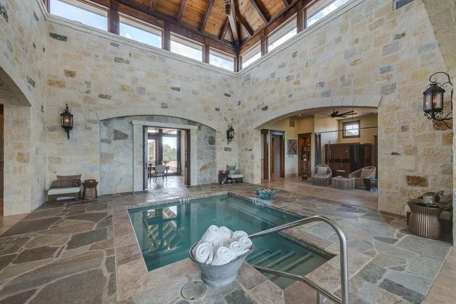 3,359 s.f. spa building. Bridged outdoor waterfall and stream entrance. Interior hot tub, treatment rooms, yoga room, dry sauna, steam shower, and therapeutic Vichy shower. Relaxing luxuries include an outdoor covered pavilion with fireplace and outdoor TV, Lutron system, iPad controllers, Sonos sound system inside and out, laundry center and prep kitchen. The intricate ceilings were built by Texas Timber Frames.