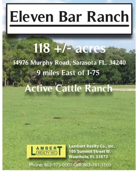 11 Bar Ranch, single family owned for generations and never before offered for sale. Located approximately 2 1/4 miles south of Fruitville Road from its Eastern end. It is approximately 9 miles East of I-75 and has approximately 3/4 mile of frontage on Myakka State Park and 1/4 mile on what was once known as High Hat Ranch. This 118 acre country side retreat has an abundance of game including deer, turkey and wild hogs. The property is predominantly characterized by its breathtaking views of grand oak hammocks and green pastures that only time and Mother Nature can reproduce. The ranch style property is a perfect setting for a secluded estate or equestrian ranch in an old Florida setting. Don't miss out on this one of a kind, call today to schedule your appt!