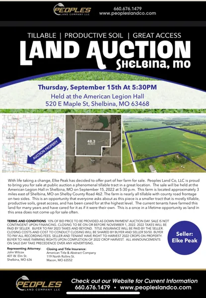 Description: With life taking a change, Elke Peak has decided to offer part of her farm for sale. Peoples Land Co, LLC is proud to bring you for sale at public auction a phenomenal tillable tract in a great location. The sale will be held at the American Legion Hall in Shelbina, MO on September 15, 2022 at 5:30 p.m. This farm is located approximately 3 miles east of Shelbina, MO on Shelby County Road 462. The farm is nearly all tillable with county road frontage on two sides. This is an opportunity that everyone asks about as this piece is a smaller tract that is mostly tillable, productive soils, great access, and has been cared for at the highest level. The current tenants have farmed this land for many years and have cared for it as if it were their own. This is a once in a lifetime opportunity as la...