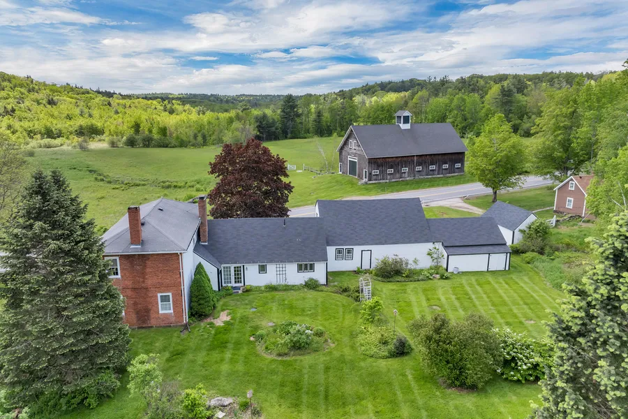 ELM FARM - aka the Nutt-Kingsbury House, is an eye-catching farm located along a country highway and is a landmark in the historic town of Francestown. Well protected from development, it has 2,400'+ of protective frontage spanning both sides of the road. The 3BR/2BA Georgian-style home has stood the test of time and still displays traces of its early life. Its ell and sheds are thought to date back to 1767, predating the brick portion. The 1856 40'x83' drive-through barn across from the house stands tall and square, showcasing its care and long history of housing sheep & cattle, along with hay. The house and cute 1BR rental cottage sit on 7.07 acres. The barnside 41+ acres consists of hay, meadow, and woodlands. A generous conservation easement here excludes 3/4 acre around the barn, allowing for any endeavor with town approval, and also excludes a 2-acre home site carved out at the top...