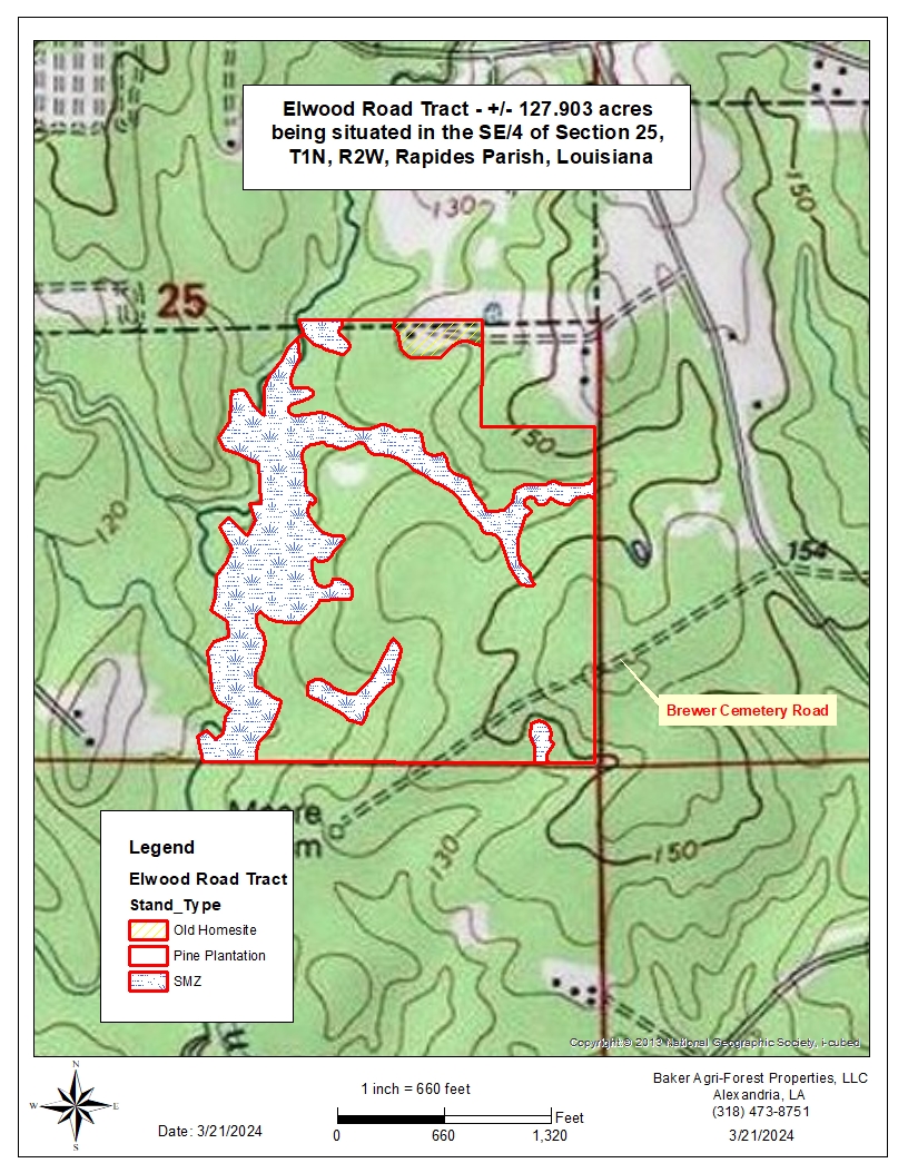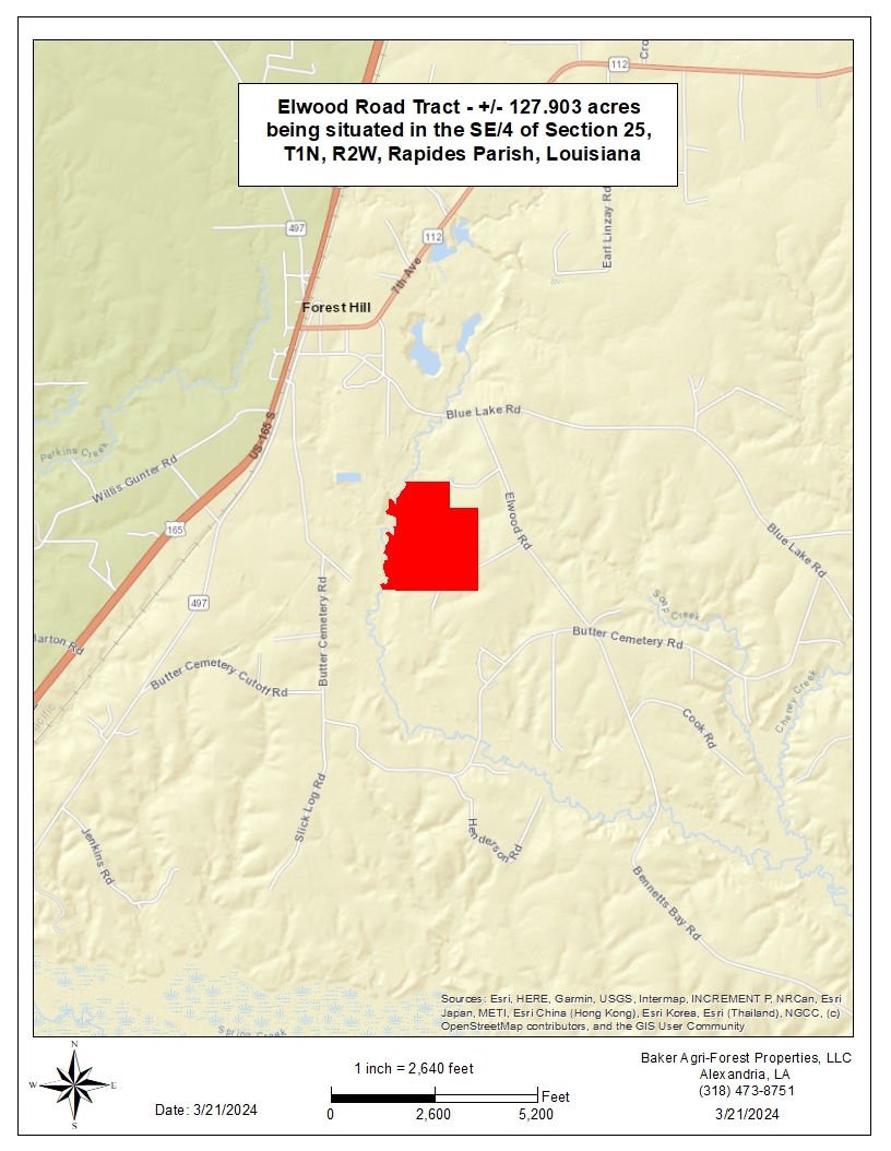 The second access route is to head south on Elwood Road from the interesection with Blue Lake Road a distance of about 6/10ths of a mile and turn right on Brewer Cemetery Road, a Rapides Parish public road that has been confirmed with the Rapides Parish Police Jury by this firm. Proceed on this public road just over 1/4 mile to hit the east line of the sugject tract. The road continues through the subject tract and exits the property on the south line, before arriving at Brewer Cemetery. Please refer to maps for details.