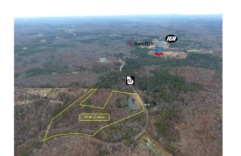 This is offering of 17.44 +/- acres for sale in southeastern Pickens County. The site has excellent visibility and is very accessible as there is over 1,000 of frontage on Hwy 53 and roughly 500 on Evon Mark Trail. There is a small 0.75-acre pond on the northwest portion of the property. The property has rolling topography and is mostly wooded. The elevation ranges from 1,460 at the southwest corner of the property to 1,360 at the southeast corner. This property is well suited as a small boutique hotel or bed and breakfast concept as it is currently zoned Highway Business. Site would also work well as a mid-size estate lot with potential long range views!